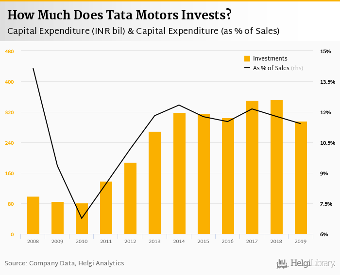 As far as Tata Motors's peers are concerned, Kamaz Group invested RUB 12.8 bil, or 6.74% of its sales in 2019. Comparable figures for Scania Group are SEK 7,558 mil and 4.96%.
