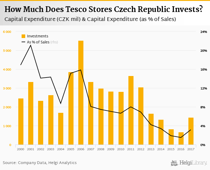 Tesco Stores Czech Republic invested a total of CZK 1,437 mil in 2017, up 117% compared to the previous year. Historically, between 2000 - 2017, the company's investments stood at a high of CZK 5,525 mil in 2006 and a low of CZK 662 mil in 2016.