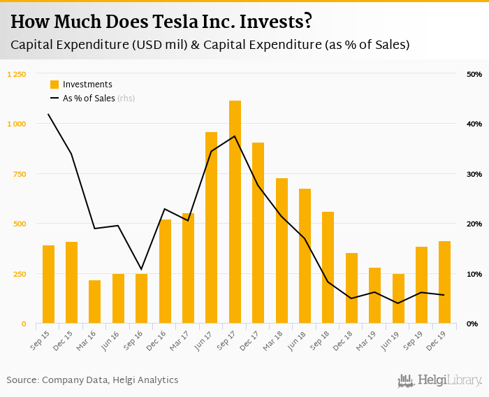 Tesla Inc. invested a total of USD 412 mil in 4Q2019, up 16.4% compared to the previous year. Historically, between 3Q2015 - 4Q2019, the company's investments stood at a high of USD 1,116 mil in 3Q2017 and a low of USD 217 mil in 1Q2016.
