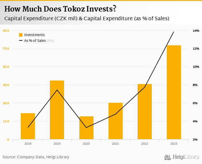 Tokoz invested a total of CZK 77.7 mil in 2023, up 69.6% compared to the previous year. Historically, between 2018 - 2023, the company's investments stood at a high of CZK 77.7 mil in 2023 and a low of CZK 19.1 mil in 2020.