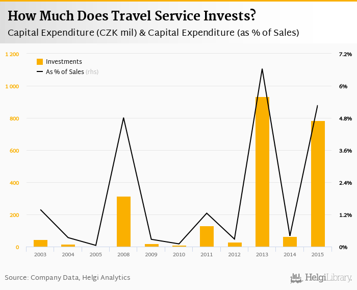 Travel Service invested a total of CZK 784 mil in 2015, up 1% compared to the previous year. Historically, between 2003 - 2015, the company's investments stood at a high of CZK 933 mil in 2013 and a low of CZK 2.00 mil in 2005.