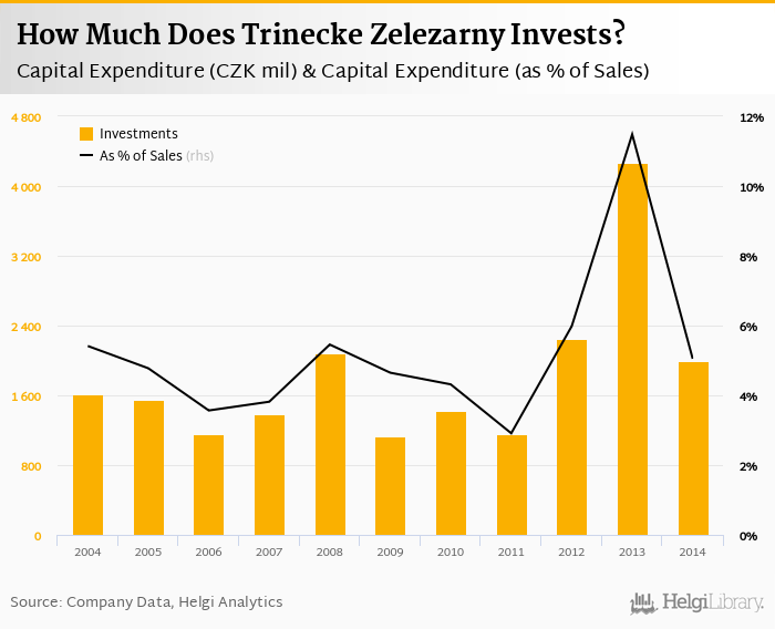Trinecke Zelezarny invested a total of CZK 1,998 mil in 2014, down 53.1% compared to the previous year. Historically, between 2004 - 2014, the company's investments stood at a high of CZK 4,261 mil in 2013 and a low of CZK 1,130 mil in 2009.