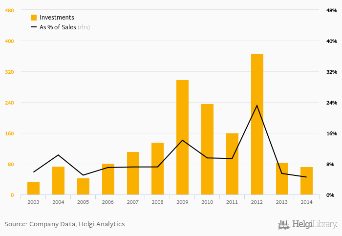 As a percentage of total sales, investments stood at 4.52% in 2014, down from 5.46% as seen in the previous year. This is compared to an average of 10.4% over the last five years.