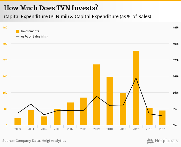 TVN invested a total of PLN 72.1 mil in 2014, down 14.3% compared to the previous year. Historically, between 2003 - 2014, the company's investments stood at a high of PLN 366 mil in 2012 and a low of PLN 34.0 mil in 2003.