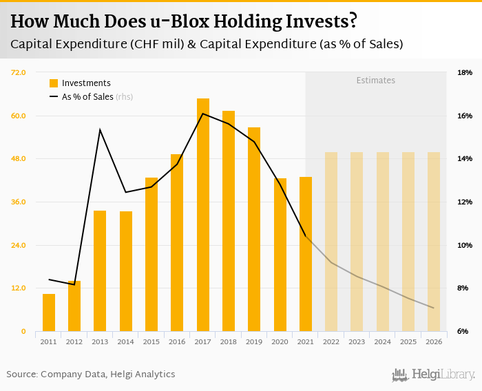 u-Blox Holding invested a total of CHF 43.1 mil in 2021, up 0.892% compared to the previous year. Historically, between 2011 - 2021, the company's investments stood at a high of CHF 64.9 mil in 2017 and a low of CHF 10.5 mil in 2011.