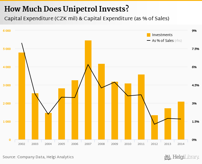 As far as Unipetrol's peers are concerned, PKN invested PLN 3,700 mil, or 3.46% of its sales in 2014. Comparable figures for MOL are HUF 356,868 mil and 7.33%.