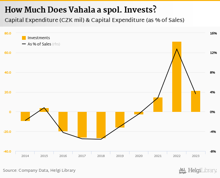 Vahala a spol. invested a total of CZK 21.5 mil in 2023, down 69.9% compared to the previous year. Historically, between 2014 - 2023, the company's investments stood at a high of CZK 71.3 mil in 2022 and a low of CZK -26.6 mil in 2018.