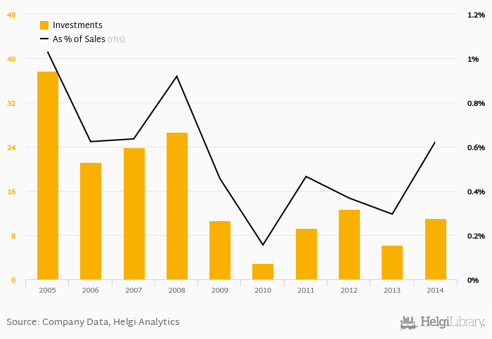 As a percentage of total sales, investments stood at 0.622% in 2014, up from 0.295% as seen in the previous year. This is compared to an average of 0.381% over the last five years.
