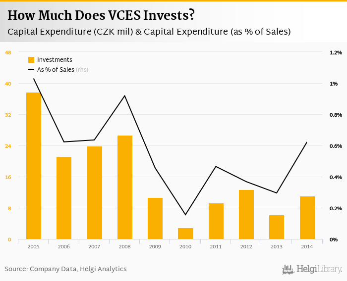 VCES invested a total of CZK 11.0 mil in 2014, up 77% compared to the previous year. Historically, between 2005 - 2014, the company's investments stood at a high of CZK 37.7 mil in 2005 and a low of CZK 2.96 mil in 2010.