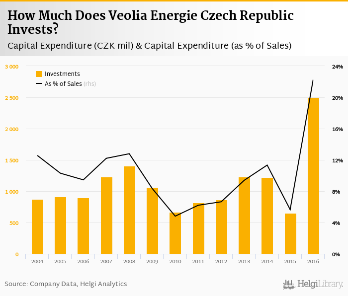 Veolia Energie Czech Republic invested a total of CZK 2,503 mil in 2016, up 284% compared to the previous year. Historically, between 2004 - 2016, the company's investments stood at a high of CZK 2,503 mil in 2016 and a low of CZK 652 mil in 2015.