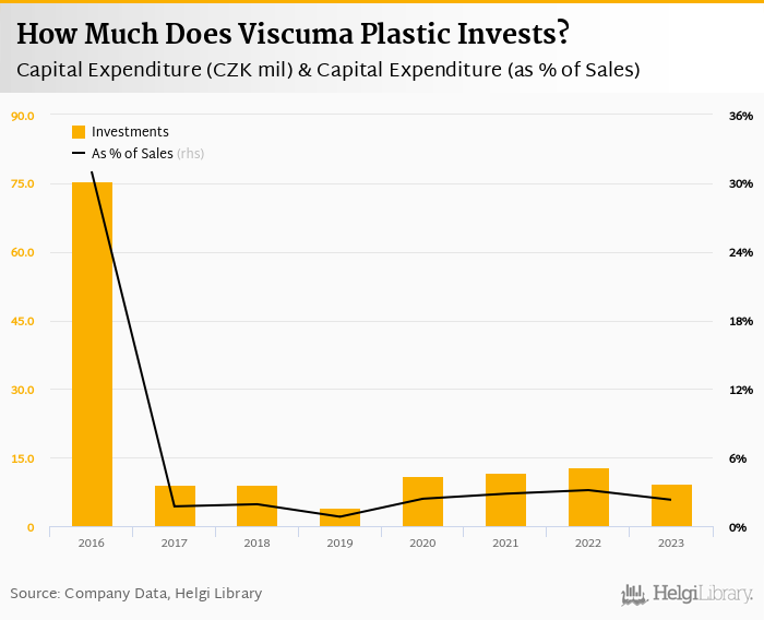 Viscuma Plastic invested a total of CZK 9.39 mil in 2023, down 26.6% compared to the previous year. Historically, between 2016 - 2023, the company's investments stood at a high of CZK 75.5 mil in 2016 and a low of CZK 4.06 mil in 2019.