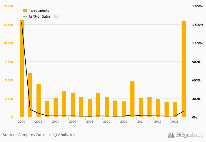 As a percentage of total sales, investments stood at 92.6% in 2019, up from 15.3% as seen in the previous year. This is compared to an average of 32.1% over the last five years.