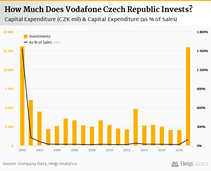Vodafone Czech Republic invested a total of CZK 12,973 mil in 2019, up 526% compared to the previous year. Historically, between 2000 - 2019, the company's investments stood at a high of CZK 13,082 mil in 2000 and a low of CZK 2,073 mil in 2018.