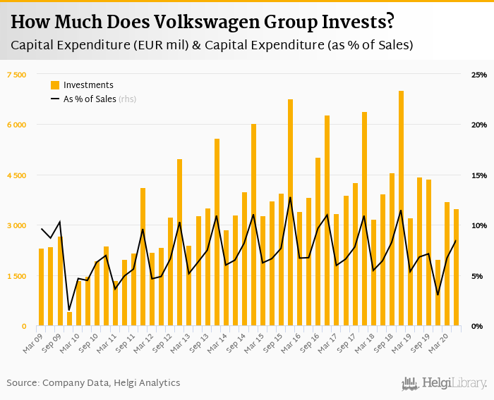 Volkswagen Group invested a total of EUR 3,486 mil in 2Q2020, down 21.3% compared to the previous year. Historically, between 1Q2009 - 2Q2020, the company's investments stood at a high of EUR 7,025 mil in 4Q2018 and a low of EUR 421 mil in 4Q2009.