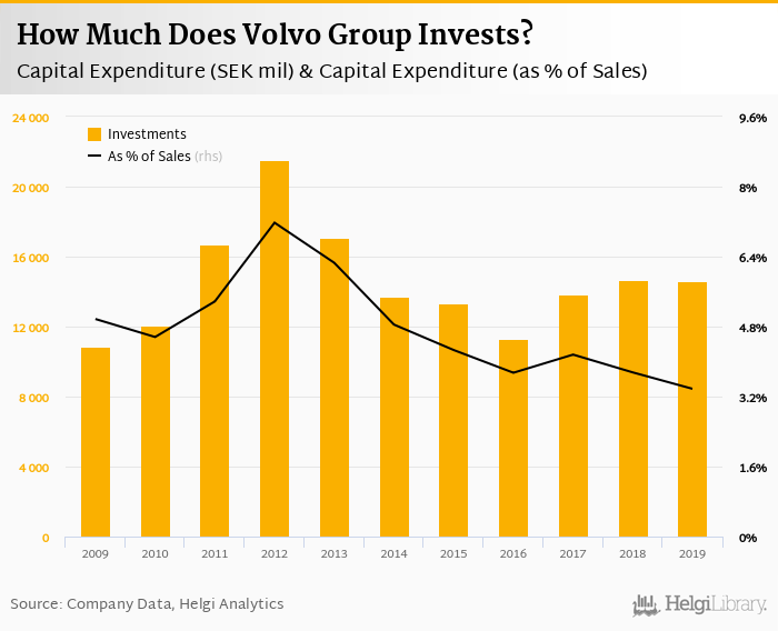Volvo Group invested a total of SEK 14,591 mil in 2019, down 0.518% compared to the previous year. Historically, between 2009 - 2019, the company's investments stood at a high of SEK 21,514 mil in 2012 and a low of SEK 10,861 mil in 2009.