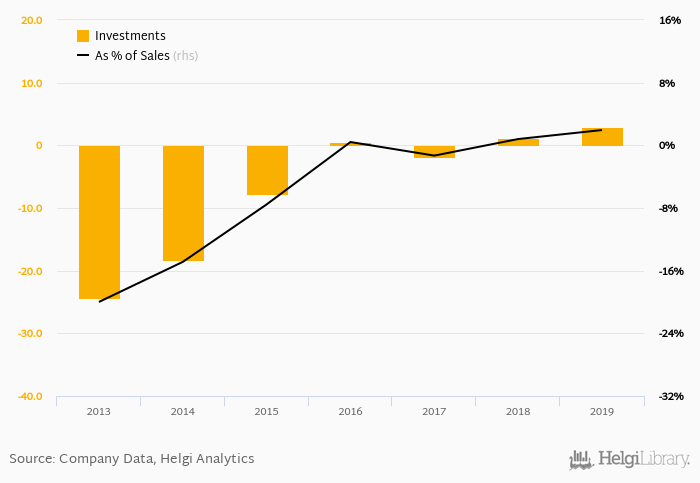 As a percentage of total sales, investments stood at 1.95% in 2019, up from 0.803% as seen in the previous year. This is compared to an average of -1.14% over the last five years.
