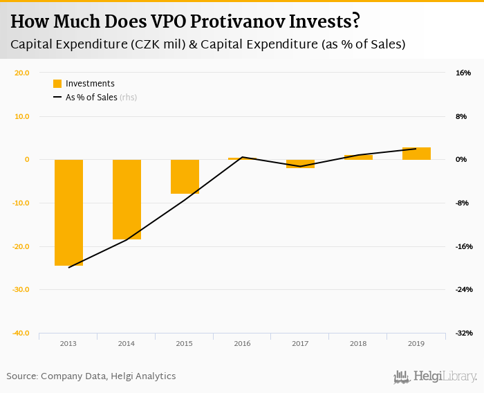 VPO Protivanov invested a total of CZK 2.92 mil in 2019, up 155% compared to the previous year. Historically, between 2013 - 2019, the company's investments stood at a high of CZK 2.92 mil in 2019 and a low of CZK -24.3 mil in 2013.