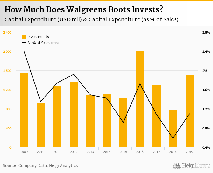Walgreens Boots invested a total of USD 1,510 mil in 2019, up 91.9% compared to the previous year. Historically, between 2009 - 2019, the company's investments stood at a high of USD 2,010 mil in 2016 and a low of USD 787 mil in 2018.