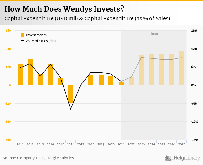 Wendys invested a total of USD 22.9 mil in 2021, down 63.6% compared to the previous year. Historically, between 2011 - 2021, the company's investments stood at a high of USD 177 mil in 2012 and a low of USD -112 mil in 2016.