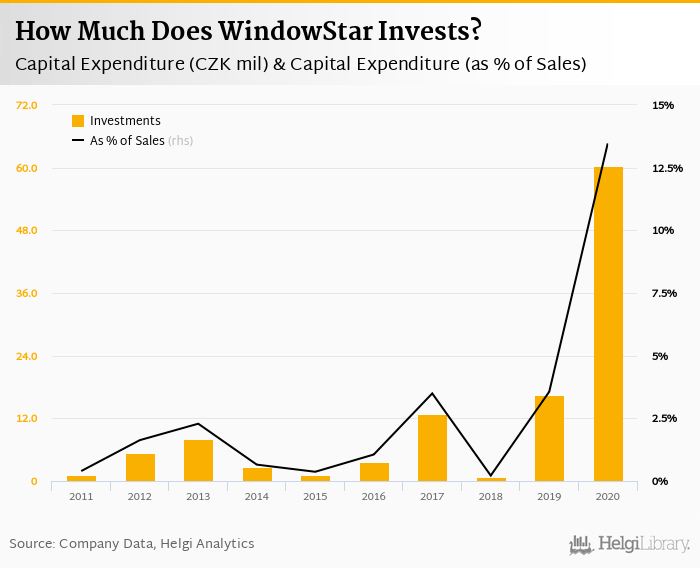 WindowStar invested a total of CZK 60.4 mil in 2020, up 265% compared to the previous year. Historically, between 2011 - 2020, the company's investments stood at a high of CZK 60.4 mil in 2020 and a low of CZK 0.797 mil in 2018.
