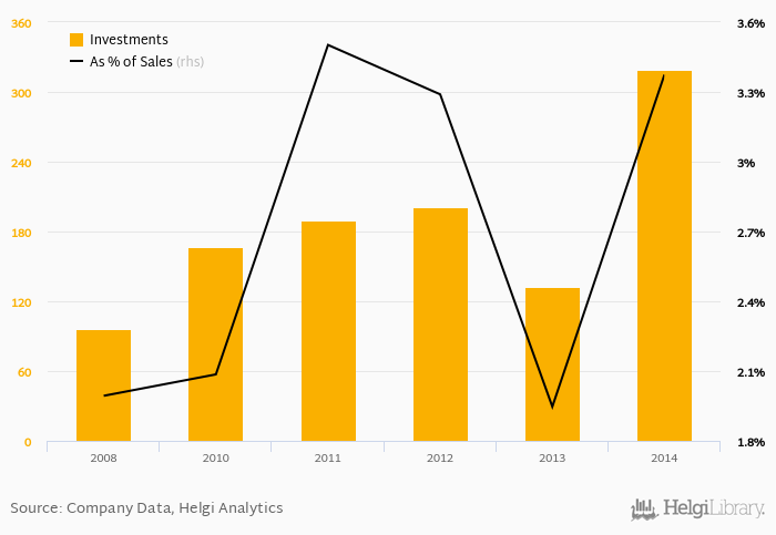 As a percentage of total sales, investments stood at 3.37% in 2014, up from 1.95% as seen in the previous year. This is compared to an average of 2.84% over the last five years.