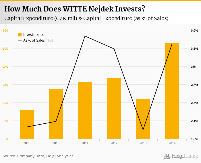 WITTE Nejdek invested a total of CZK 319 mil in 2014, up 141% compared to the previous year. Historically, between 2008 - 2014, the company's investments stood at a high of CZK 319 mil in 2014 and a low of CZK 95.9 mil in 2008.