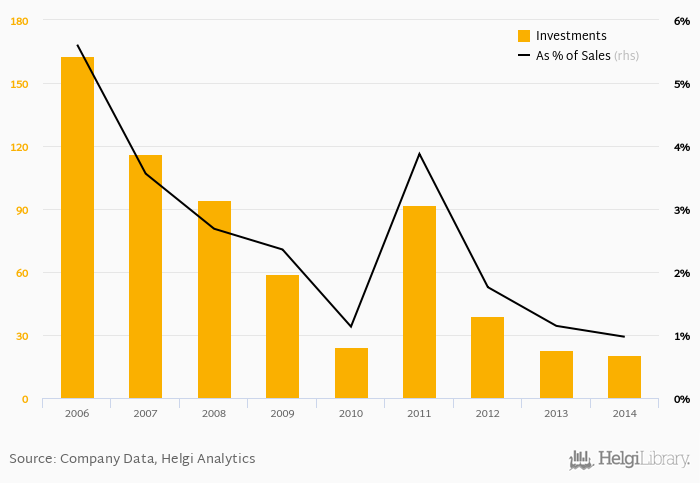 As a percentage of total sales, investments stood at 0.972% in 2014, down from 1.14% as seen in the previous year. This is compared to an average of 1.78% over the last five years.