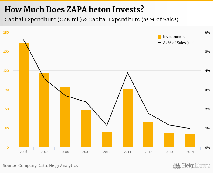 ZAPA beton invested a total of CZK 20.5 mil in 2014, down 10.1% compared to the previous year. Historically, between 2006 - 2014, the company's investments stood at a high of CZK 163 mil in 2006 and a low of CZK 20.5 mil in 2014.