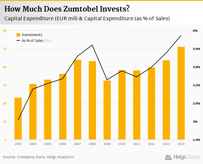 Zumtobel invested a total of EUR 76.6 mil in 2014, up 16.8% compared to the previous year. Historically, between 2003 - 2014, the company's investments stood at a high of EUR 76.6 mil in 2014 and a low of EUR 34.8 mil in 2003.