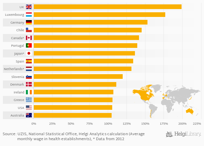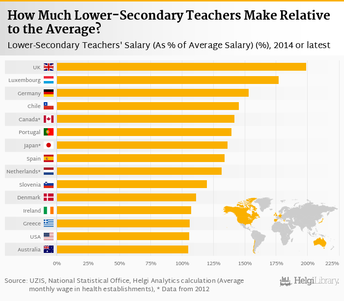 Based on a comparison of 30 countries in 2014, United Kingdom ranked the highest in lower-secondary teachers' salary as a percentage of average salary with 199% followed by Luxembourg and Germany. On the other end of the scale was Hungary with 60.9%, Iceland with 64.2% and Estonia with 64.4%.