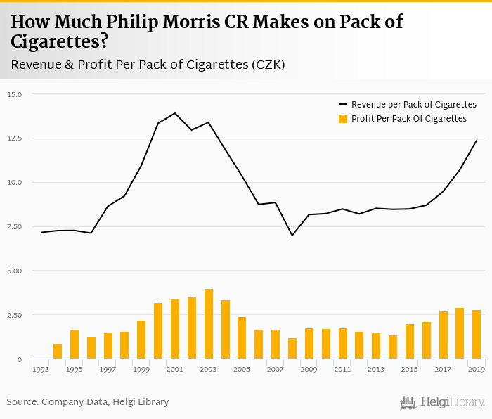 We guesstimate that the company made a net profit of CZK 2.77 per pack of cigarettes sold in 2019. That is 104% more than 5 years ago and 58.6% more than a decade ago.