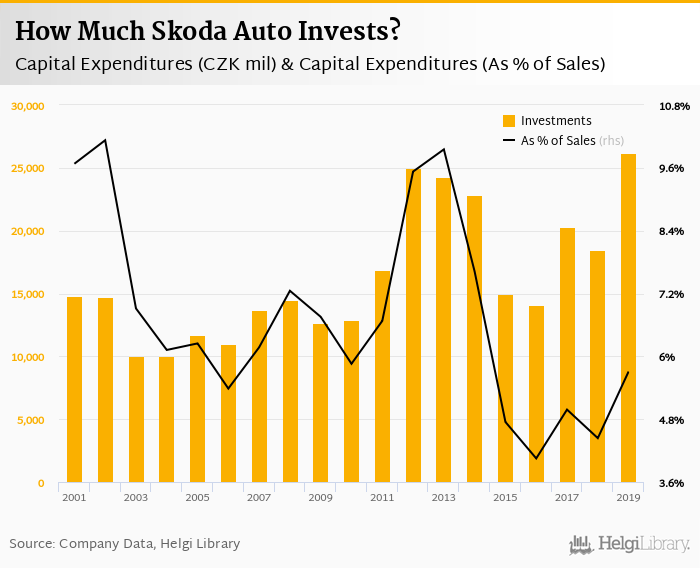 As far as Skoda Auto's peers are concerned, Hyundai Motor Manufacturing Czech invested CZK 1,205 mil, or 0.978% of its sales in 2019. The comparable figures for Volkswagen Group are CZK 13,993 mil and 5.54% respectively and CZK 1,068 mil and 9.58% at SEAT on 2019 numbers.