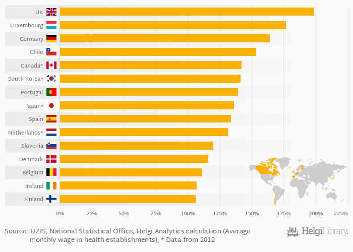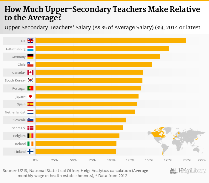Based on a comparison of 31 countries in 2014, United Kingdom ranked the highest in upper-secondary teachers' salary as a percentage of average salary with 199% followed by Luxembourg and Germany. On the other end of the scale was Estonia with 64.4%, Iceland with 65.0% and Slovakia with 67.5%.