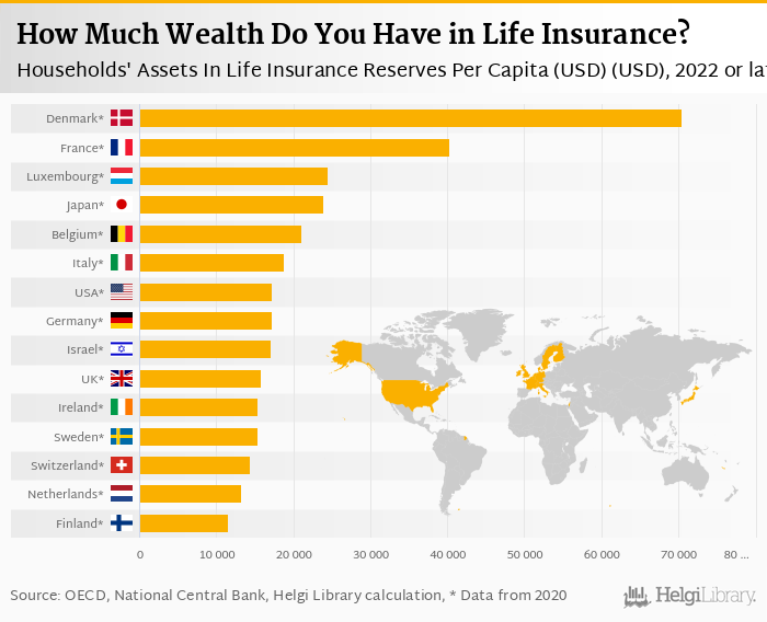 Based on a comparison of 35 countries in 2022, Denmark ranked the highest in households' assets in life insurance reserves per capita with USD 70,511 followed by France and Luxembourg. On the other end of the scale was Turkey with USD 25.1, Colombia with USD 169 and Mexico with USD 259.
