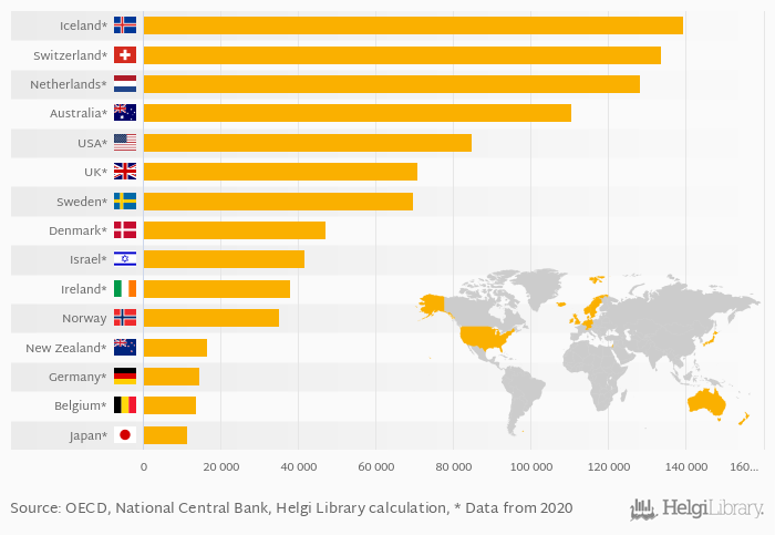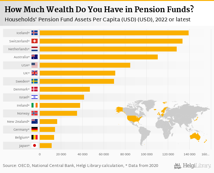 Based on a comparison of 34 countries in 2022, Iceland ranked the highest in households' pension fund assets per capita with USD 139,435 followed by Switzerland and Netherlands. On the other end of the scale was Turkey with USD 259, Greece with USD 330 and Hungary with USD 770.