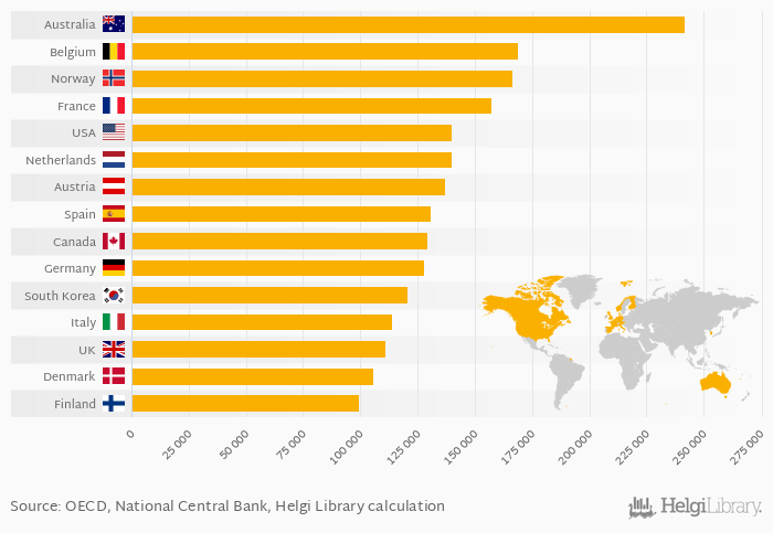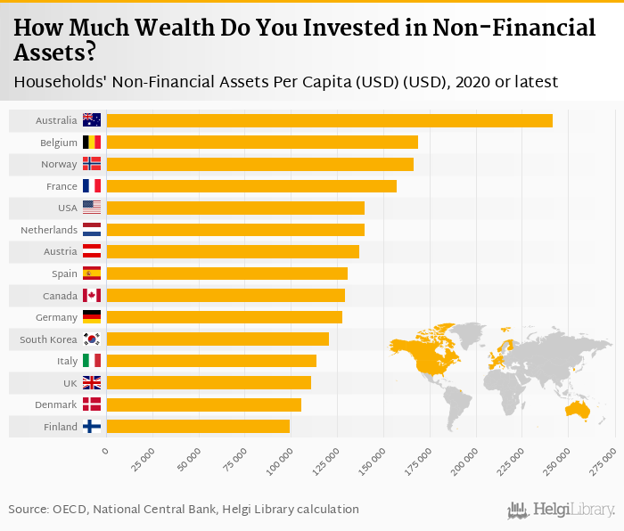 Based on a comparison of 25 countries in 2020, Australia ranked the highest in households' non-financial assets per capita with USD 241,682 followed by Belgium and Norway. On the other end of the scale was Poland with USD 11,077, Mexico with USD 15,157 and Lithuania with USD 23,726.