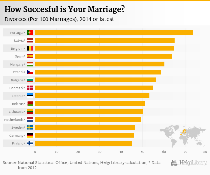 Based on a comparison of 36 countries in 2014, Portugal ranked the highest in divorces per 100 marriages with 73.7 followed by Latvia and Belgium. On the other end of the scale was Kosovo with 7.73, Bosnia and Herzegovina with 7.75 and Macedonia with 13.8.