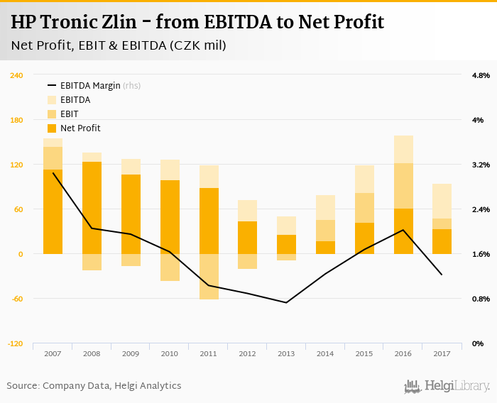 HP Tronic Zlin made a net profit of CZK 32.9 mil with revenues of CZK 7,774 mil in 2017, down by 46.2% and down by 1.37%, respectively, compared to the previous year. This translates into a net margin of 0.423%.
