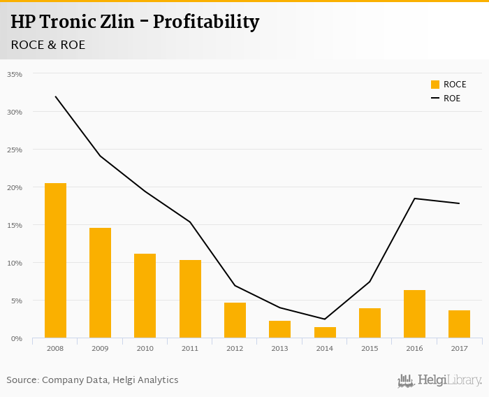 HP Tronic Zlin made a net profit of CZK 32.9 mil in 2017, down 46.2% compared to the previous year. Historically, between 2007 and 2017, the company's net profit reached a high of CZK 123 mil in 2008 and a low of CZK 16.8 mil in 2014.
