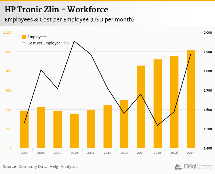 HP Tronic Zlin employed 1,017 employees in 2017, up 6.16% compared to the previous year. Historically, between 2007 and 2017, the firm's workforce hit a high of 1,017 employees in 2017 and a low of 355 employees in 2010.