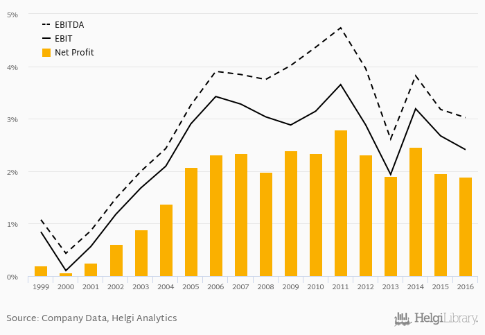 On the operating level, the EBITDA margin reached 3.02% and EBIT amounted to 2.41% of sales in 2016.
