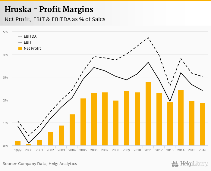Hruska made a net profit of CZK 138 mil with revenues of CZK 7,321 mil in 2016, down by 7.48% and down by 4.23%, respectively, compared to the previous year.