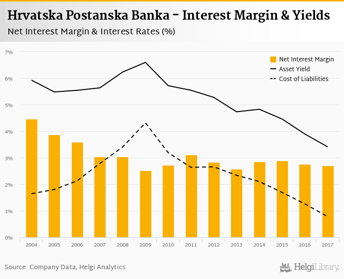 Hrvatska Postanska Banka's net interest margin amounted to 2.71% in 2017, down from 2.76% compared to the previous year.