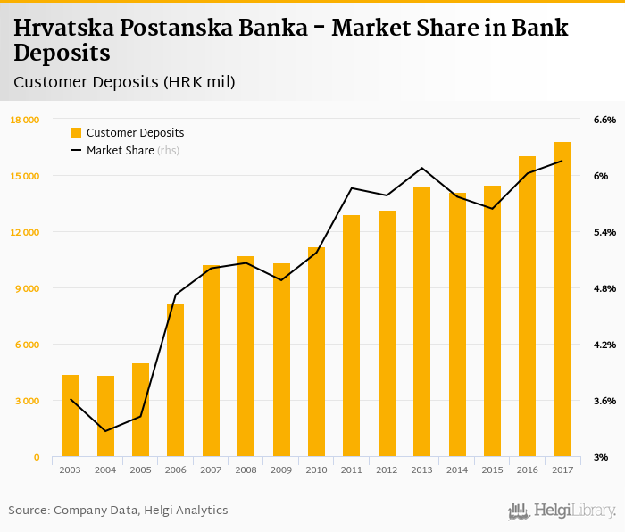Hrvatska Postanska Banka accounted for 6.15% of all customer deposits taken by banks in Croatia at the end of 2017. Historically, the bank’s market share in customer deposits reached an all time high of 6.15% in 2017 and an all time low of 3.27% in 2004.