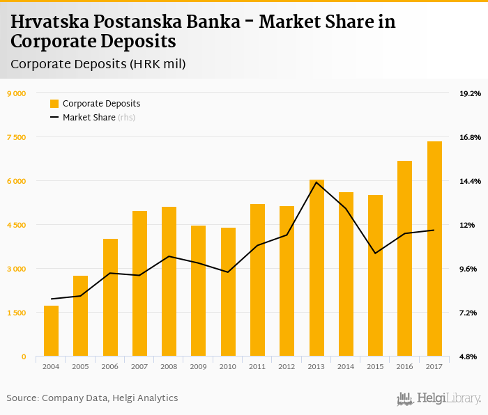 Hrvatska Postanska Banka accounted for 11.7% of all corporate deposits taken by banks in Croatia at the end of 2017. Historically, the bank’s market share in corporate deposits reached an all time high of 14.3% in 2013 and an all time low of 7.91% in 2004.