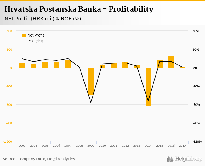 Comparing Hrvatska Postanska Banka with its closest peers, Zagrebacka Banka generated a net profit of HRK 1,042 mil with ROE of 5.66% in 2017, Splitska Banka netted HRK -85.0 mil (ROE of -2.34%) and Privredna Banka Zagreb announced a net profit of HRK 1,331 mil implying ROE of 7.98%.