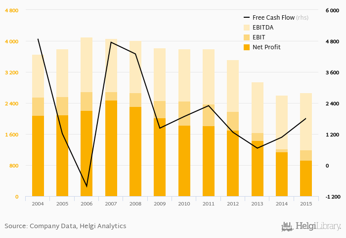 The company generated cash, defined by a sum of net profit and depreciation, of HRK 2,394 mil or 34.1% of sales. When investments are excluded, free cash flow reached HRK 1,808 mil, or 25.8% of sales in 2015.