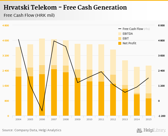 On the operating level, EBITDA reached HRK 2,668 mil, up 2.34% compared to the previous year. Over the last five years, the company's EBITDA has fallen 6.8% a year on average.
