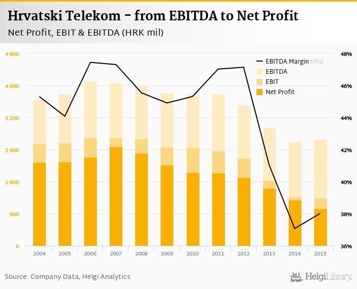 Hrvatski Telekom made a net profit of HRK 925 mil with revenues of HRK 7,017 mil in 2015, down by 19.1% and down by 0.213%, respectively, compared to the previous year. This translates into a net margin of 13.2%.
