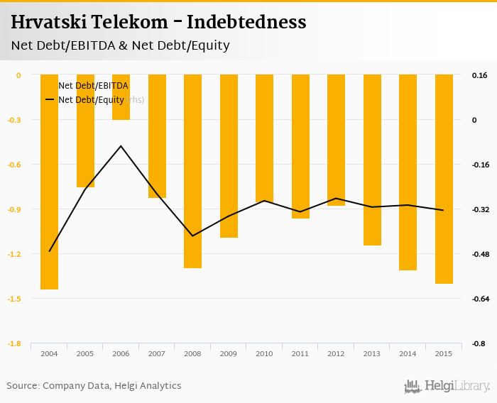 Hrvatski Telekom's net debt stood at HRK -3,739 mil and accounted for -0.326 of equity at the end of 2015. The ratio is down 0.019 pp compared to the previous year.